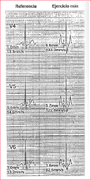 En el 17% de los pacientes asintomáticos y en el 50% de los sujetos sintomáticos con Wolff-Parkinson-White se observa un intervalo R-R preexcitado menor de 250 mseg durante los episodios de FA(121, 122). Al parecer, habría mayor riesgo de fibrilación ventricular cuando a un R-R preexcitado menor de 250 mseg se suma la existencia de más de una vía accesoria(123), lo que resulta lógico, ya que con múltiples haces se incrementa la posibilidad de circuitos reentrantes complejos. Por el contrario, la preexcitación intermitente durante el ejercicio(124), o más aún en estado basal(125), indica la existencia de un período refractario anterógrado prolongado de la vía anómala. Hemos observado la desaparición de la preexcitación en un tercio de los pacientes con Wolff-Parkinson-White sometidos a una prueba de esfuerzo (figura 2). Debe recordarse que para ser considerada de buen pronóstico, la pérdida de la preexcitación con el ejercicio ha de ocurrir en forma brusca. De lo contrario, una progresiva mejoría de la conducción nodal producida por el aumento del tono simpático puede enmascarar una vía con un período refractario corto(126). Debe intentarse la documentación electrocardiográfica que permita demostrar una correlación entre los síntomas y las arritmias en los pacientes con síndrome de Wolff-Parkinson-White. Así, frente a un paciente con Wolff-Parkinson-White y síncope es conveniente excluir otras causas (en primer término el síncope neurocardiogénico), que de existir, indican que la ablación por catéter no habrá de resolver la sintomatología. En la figura 3 se observa un ECG de 12 derivaciones obtenido en un lactante con síndrome de Wolff-Parkinson-White y episodios reiterados de síncope y convulsiones. Si bien era lógico sospechar la presencia de taquiarritmias como causantes de la sintomatología, la demostración de bloqueo AV completo en el registro Holter coincidentemente con los síntomas (figura 4) llevó al implante de un marcapasos definitivo(127).