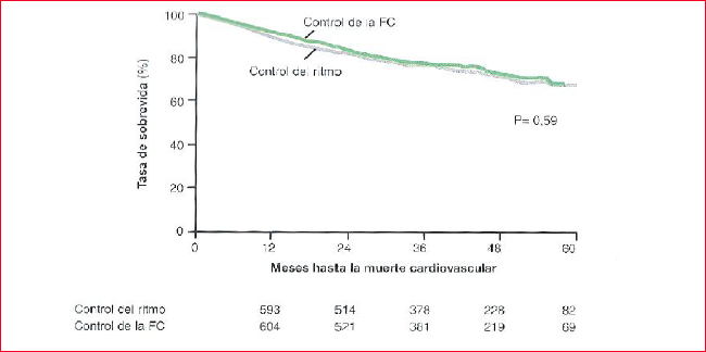 El estudio VALIANT mostró que los pacientes de la rama control del ritmo tuvieron doble mortalidad en los primeros 45 días en comparación con los pacientes asignados a la estrategia de control de la frecuencia cardíaca(104).