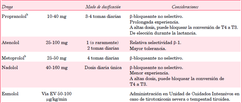 La cardioversión de la FA generalmente resulta inefectiva o se observa una alta tasa de recurrencias en tanto no se logre un estado eutiroideo(49). Por lo tanto, el tratamiento de la FA en el hipertiroidismo comienza con el control de la frecuencia cardíaca con betabloqueantes (en especial en ausencia de insuficiencia cardíaca descompensada)(6,50). Estos fármacos favorecen el control de la ansiedad o los temblores asociados a la sobreexpresión de los receptores b1. En la tabla 1 se describen los distintos betabloqueantes utilizados en el tratamiento del hipertiroidismo según las recomendaciones de American Thyroid Association / American Society of Clinical Endocrinologists (ATA/ASCE)(48).