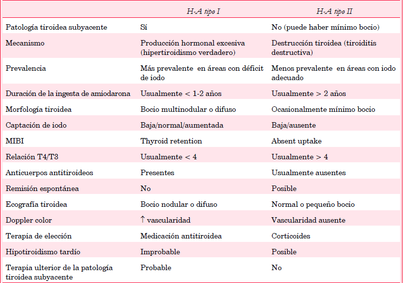 Existen dos formas de presentación clínica. El hipertiroidismo A (HT-A) tipo I ocurre en pacientes con enfermedad tiroidea preexistente, principalmente enfermedad de Graves latente o bocio nodular. En estos pacientes, la sobrecarga de iodo gatilla la síntesis excesiva de hormonas tiroideas provocando hipertiroidismo (fenómeno de Jod-Basedow)(59). El HT-A tipo II ocurre en pacientes con glándula previamente normal y es el resultado de la toxicidad directa del fármaco sobre el tejido tiroideo causando tiroiditis. En la actualidad esta es la forma de presentación más frecuente, con una prevalencia de 90% aproximadamente, debido a que los pacientes que en la actualidad reciben amiodarona son evaluados más frecuentemente en búsqueda de enfermedad tiroidea preexistente.