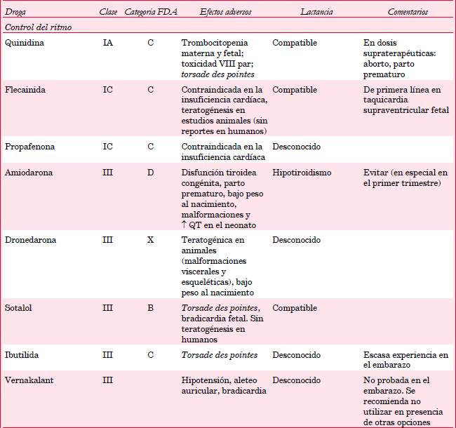 La absorción, distribución, metabolización y excreción de los fármacos se encuentran alteradas por los cambios fisiológicos que acontecen en el embarazo. El mayor tiempo de vaciamiento gástrico e intestinal pueden afectar la absorción, mientras que el aumento del volumen intravascular aumenta el volumen de distribución. Las concentraciones de albúmina disminuyen, por lo que aumenta la fracción de fármacos que circulan libres en el plasma. Por su parte, el aumento del gasto cardíaco incrementa el filtrado glomerular, aumentando el clearance por orina. El incremento de la actividad de la citocromo P450 hepática, mediado por la acción de los estrógenos y la progesterona, incrementa el metabolismo. Las modificaciones en los niveles plasmáticos, asociadas al pasaje de la barrera placentaria, deben tenerse en cuenta cuando se analiza la administración de un agente antiarrítmico y se debe evaluar el beneficio de la reducción o eliminación de la arritmia en comparación con los efectos indeseables del tratamiento.