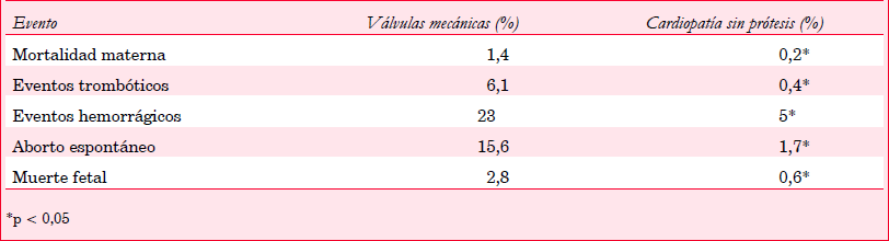 La tasa de nacidos vivos libres de eventos en mujeres con válvulas protésicas mecánicas fue de 58% vs 78% en cardiópatas embarazadas sin prótesis mecánicas, y más de 90% en ausencia de enfermedad cardíaca.