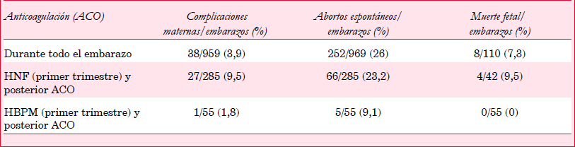 En el registro ROPAC también se analizaron los diferentes esquemas de anticoagulación utilizados y su relación con los efectos adversos en las embarazadas con prótesis valvulares. El uso de antagonistas de la vitamina K durante el embarazo se relacionó con menor número de nacidos vivos (p < 0,026), y mayores tasas de abortos espontáneos (28,6% vs 9,2%; p < 0,001) y de muerte fetal tardía (7,1% vs 0,7%; p < 0,016). No hubo diferencia significativa en la ocurrencia de los eventos mencionados en relación con las dosis (elevadas o bajas) de los antagonistas de la vitamina K. Un dato sorprendente de este registro es la amplia variedad de regímenes de anticoagulación utilizados en pacientes con prótesis valvulares mecánicas, con una coincidencia con las recomendaciones de los diferentes consensos en solo el 20% de los casos. Estos datos reflejan que no existe en la actualidad un esquema de anticoagulación universalmente aceptado.