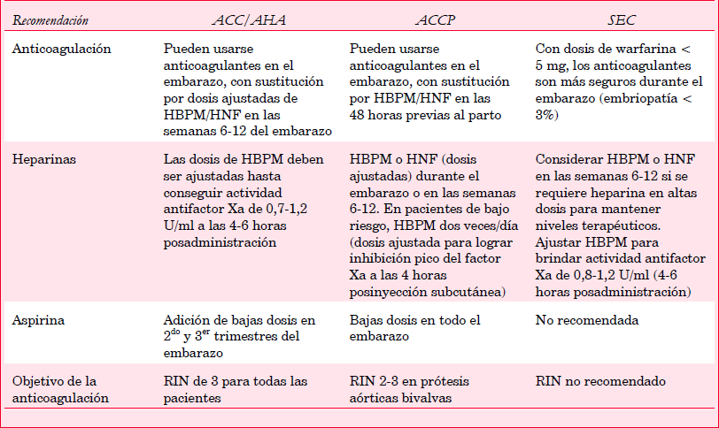 Pacientes con prótesis y alto riesgo embólico (prótesis valvulares mecánicas de primera generación en posición mitral y/o antecedente de embolia, presencia de FA o disfunción ventricular): la tabla 7 describe las recomendaciones de ACC/AHA, ACCP y SEC en relación con el tratamiento anti- coagulante en este grupo de alto riesgo(98,99,100).