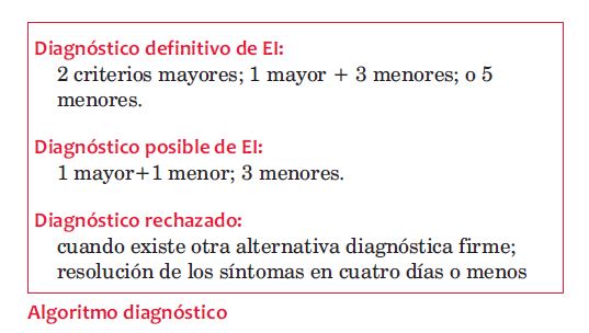 El diagnóstico clínico de EI basado en la clásica tríada de síntomas y signos: 1) de infección, 2) embólicos, algunos de origen inmuno-alérgico, y 3) cardíacos, como la aparición o modificación de un soplo y la presencia de falla cardíaca, se realiza en un número menor de pacientes.