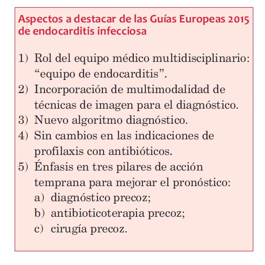 La endocarditis infecciosa (EI) se ha convertido en una enfermedad heterogénea que ha cambiado su perfil clínico y epidemiológico. Posiblemente por esta razón en 2015 se han publicado actualizaciones de las Guías de la Sociedad Europea de Cardiología (ESC) y de la Asociación Americana del Corazón (American Heart Association, AHA)(1, 2); nos referiremos a las primeras.