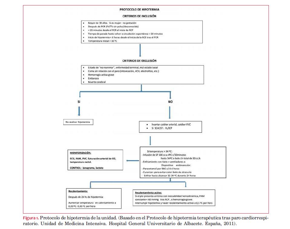 Al ingreso no presenta apertura ocular, gestos faciales al estímulo nociceptivo, extenso-pronación de miembros, SCG 5. Pupilas intermedias, reflejo fotomotor positivo bilateral. Sin elementos de falla cardíaca. Hemodinamia estable. El ECG evidencia RS de 80 cpm, QS de V1 a V4 con supradesnivel del ST de 2 mm. CACG de urgencia: estenosis intrastent de ADA; se realiza ATPC de la misma. Se aplica protocolo de hipotermia (figura 1), con necesidad de prolongarlo por 48 horas por ascenso térmico mayor a lo previsto durante fase de recalentamiento. El ETT 48 horas después evidencia VI dilatado con extensa zona de aquinesia septal anterior y posterior; FEVI 22%. Presentó como complicación neumonía asociada a la ventilación mecánica. Se extuba con buena tolerancia a los 20 días del ingreso. Se implanta cardiodesfibrilador. Alta de CTI a los 26 días de su ingreso, lúcido, y sin déficit neurológico.