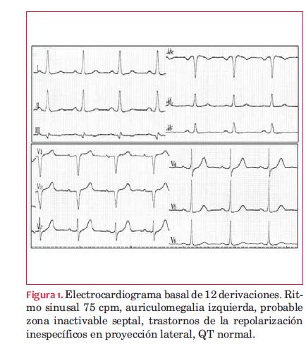 Paciente de 65 años, sexo femenino, sedentaria, hipertensa, dislipémica e hipotiroidea, portadora de cardio patía isquémica. Hace diez años sufrió infarto de miocardio infero-posterior, se realizó angioplastia coronaria percutánea primaria con implante de un stent metálico sobre el segundo ramo marginal. Recibe tratamiento con tetrayodotironina, losartán, atorvastatina yaspirinaadosisplenassegúnlasrecomendacionesactuales(10), con buena tolerancia. Es derivada para una ergometríaporanginacrónicaclasefuncional IIdecinco meses de evolución. Eco Doppler transtorácico: fracción de eyección del ventrículo izquierdo (FEVI)=65% (método elipsoide), motilidad global y segmentaria del VI normal, sin valvulopatías.. En el gabinete de ergometría la paciente estaba normocoloreada, eupneica, índice de masa corporal (IMC): 31 kg/m2, presión arterial (PA) = 140/80 mmHg, auscultación cardíaca central: ritmo regular de 75 cpm sin soplos, campos pulmonares libres. El electrocardiograma (ECG) basal se muestra en la figura 1.