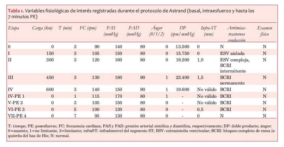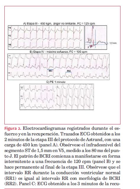 Tras obtener el consentimiento informado por escrito se realizó un esfuerzo graduado y continuo en ciclo-ergómetro siguiendo protocolo de Astrand, bajo monitoreo ECG continuo y controles de PA en cada etapa del esfuerzo y en el posesfuerzo (PE). En la etapa II (300 kgm) la paciente instaló ángor e infradesnivel del segmento ST horizontal de 1 mm en V5, que alcanzó 1,5 mm en la etapa III (450 kgm, figura 2). Al primer minuto de esta etapa se registró extrasistolía ventricular en duplas y bloqueo completo de rama izquierda (BCRI) intermitente, que se hizo permanente a una frecuencia de 125-130 cpm (figura 2). Al final de la etapa IV se registró una caída de la PA sistólica de 30 mmHg, que en este contexto obligó a suspender la prueba. Durante la recuperación, la conducción ventricular basal se restableció a una frecuencia de 95 cpm (intervalo RR: 630 ms). En la tabla 1 se resumen los datos clínicos, ECG y hemodinámicos obtenidos durante la prueba.