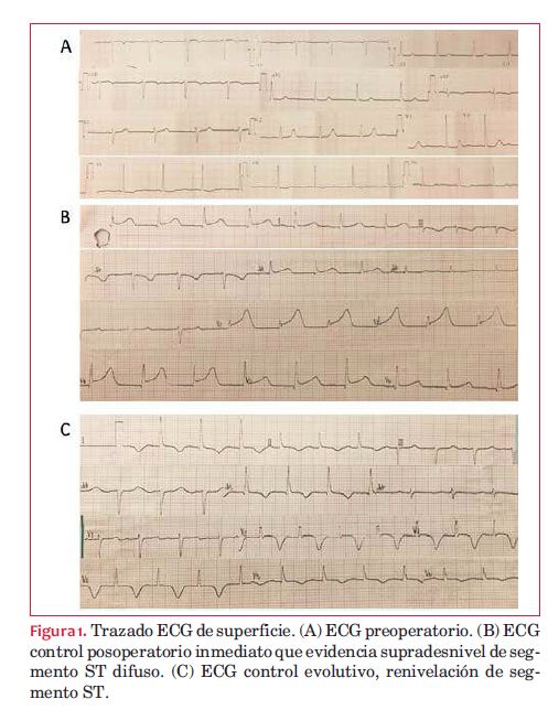 A las horas se constata una renivelación de segmento ST, asociado a una mejoría en parámetros hemodinámicos, que permite el descenso del apoyo inotrópico (figura 1-C). Es extubada a las 8 horas de la cirugía. En la evolución inmediata no presenta alteraciones electrocardiográficas. En el ecocardiograma a las 24 horas se constata una notoria mejoría de la función sistólica, con una FEVI de 60%, sin trastornos sectoriales de la contractilidad. La paciente evoluciona favorablemente, sin otras complicaciones, y recibe el alta quirúrgica a los 10 días.