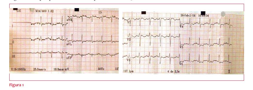 Electrocardiograma (figura 1): taquicardia sinusal de 120 cpm, onda P y PR normales, eje eléctrico no desviado, QRS 80 mseg, descenso difuso del segmento ST y supradesnivel en aVR y V1.