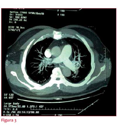 Presentamos el caso de un paciente de 57 años, sexo masculino, con antecedentes personales de trombosis venosa profunda (TVP) a los 30 años; recibió tratamiento con warfarina, suspendiéndolo sin controles posteriores. Consulta por disnea brusca y palpitaciones de 48 horas de evolución, presentando en la exploración física una taquicardia regular de 120 cpm con cadencia de galope sin otros elementos a destacar.