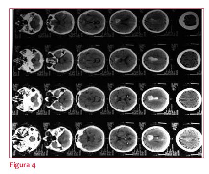 A las 24 horas instala parálisis facial central derecha y disartria. Tomografía de cráneo (TC) (figura 4): hematoma agudo frontal izquierdo. En acuerdo con neurólogo se decide continuar con controles clínicos y tomográficos en 24 horas y suspender la anticoagulación, no considerándose indicación de drenaje. La TC a las 48 horas evidencia persistencia de hematoma frontal izquierdo, sin cambios significativos. Se decide mantener sin anticoagulación por 15 días.