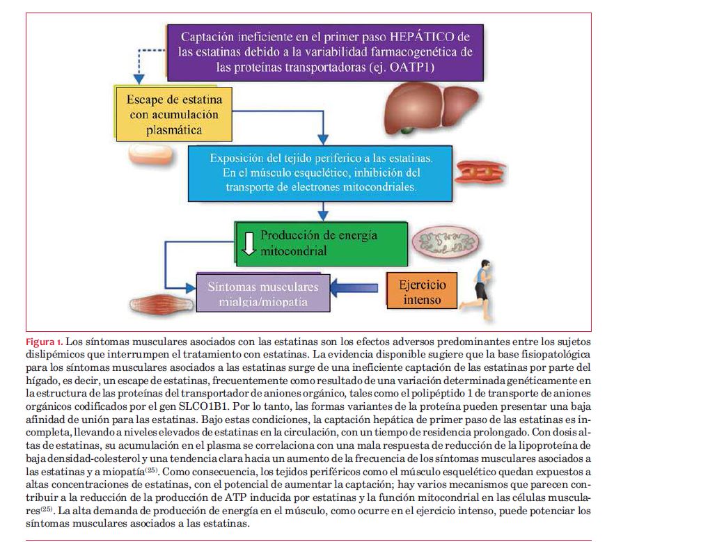 Tal como recomiendan las actuales guías europeas, las estatinas constituyen la terapia de primera línea en el manejo habitual de los pacientes dislipémicos con alto y muy alto riesgo cardiovascular en prevención primaria y secundaria(23). Mientras el metaanálisis del grupo “Cholesterol Treatment Trialists” (CTT) que analiza el uso de estatinas en ensayos controlados aleatorizados apoya claramente su eficacia clínica(11), el perfil de los efectos adversos asociados con su uso se ha ido aclarando progresivamente para revelar no sólo que los síntomas musculares asociados a las estatinas (SMAE) predominan en los estudios observacionales, registros y en la práctica clínica (rango de prevalencia 7%-29%), sino que también que son la causa principal de la interrupción del tratamiento(25). A esos efectos, el Panel de Consenso de la Sociedad Europea de Aterosclerosis (EAS) presentó recientemente una guía clínica en forma de un diagrama de flujo para el manejo de pacientes con SMAE, y reconoció que la producción de energía mitocondrial atenuada en el músculo esquelético jugaba un papel central en la fisiopatología de este síndrome; es de destacar que la captación ineficiente de las estatinas en el primer paso hepático puede ser la base del SMAE (figura 1) (25). Es también importante destacar que el SMAE es un hecho central de la “intolerancia a las estatinas”, que también incluye eventos adversos a nivel del hígado, riñón, tejidos periféricos, y potencialmente sistema nervioso central, pero cuya frecuencia es marcadamente menor que la del SMAE(25).