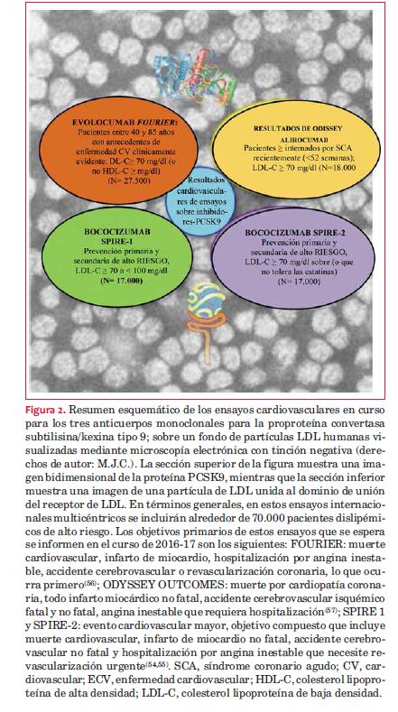 De lo arriba descrito, resulta evidente que se siguen necesitando urgentemente terapias innovadoras para la reducción de lípidos, de ser posible siempre sobre la base de un tratamiento con estatinas, para lograr hacer realidad el excepcional cuerpo de evidencia sobre la reducción de los eventos cardiovasculares vinculados al descenso de LDL-C, para así ayudar a muchos pacientes dislipidémicos en alto riesgo. Entre estos se incluyen los que presentan HF, los pacientes en prevención secundaria y aquellos que no toleran las estatinas; otras poblaciones pueden incluir individuos con diabetes, enfermedad renal crónica (ERC) y con hipercolesterolemia no familiar(15). Es en este contexto que se destaca la importancia de la reciente aprobación en EE.UU. y Europa de dos anticuerpos monoclonales humanizados contra PCSK9: alirocumab y evolocumab. Se encuentra en curso el desarrollo de un tercero, el bococizumab, que es parcialmente humanizado32. Todos son bien tolerados y tienen un perfil de seguridad satisfactorio(15, 33, 34, 35). Como se ejemplificara con alirocumab, estos anticuerpos actúan in vivo primariamente acelerando la tasa catabólica fraccional de LDL(36). Un enfoque alternativo a la reducción de las concentraciones plasmáticas de PCSK9 consiste en la inhibición directa de su producción hepática. Un medicamento novedoso de interferencia con el ARN, el ALN-PCSsc (administrado como formulación subcutánea), ha demostrado la factibilidad de esta modalidad en estudios fase 1, dando lugar a una reducción dosis-dependiente de los niveles circulantes de PCSK9 de hasta = 80%, y una reducción media de LDL-C de 40% durante períodos de 1 mes o más, con seguridad y tolerabilidad favorables(37).