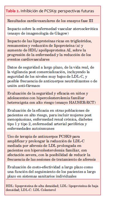 Es alentador que los análisis exploratorios de ODYSSEY LONG TERM (alirocumab, n=2.341) y OSLER (evolocumab, n=4.465) indiquen una disminución en los resultados cardiovasculares de 50%-55% en períodos de tratamiento de hasta 78 semanas(44, 48, 52). Además, un metaanálisis reciente de 24 ensayos de terapia con anticuerpos PCSK9 en el que participaron >10.000 pacientes, destacó una reducción de 55% de la mortalidad por todas las causas .p < 0,015), con disminuciones similares en la mortalidad cardiovascular y el infarto de miocardio(53). En conjunto, el programa que incluye los ensayos clínicos SPIRE para bococizumab(54, 55), el FOURIER (pacientes con antecedentes de ECV y un alto riesgo de eventos recurrentes)(56) y ODYSSEY OUTCOMES (pacientes recientemente hospitalizados para SCA)(57) involucran >70 000 pacientes dislipémicos de alto riesgo (figura 2). Si bien se prevé que los hallazgos confirmen las observaciones preliminares arriba analizadas, será esencial contar con una evaluación de la eficacia y tolerabilidad a largo plazo, y de la relación costo/beneficio de la inhibición de PCSK9. No deberíamos olvidar, sin embargo, que la trayectoria de la ECV con el tiempo no se limita a un único evento cardiovascular, y que el reducir el nivel de LDL-C otorga beneficios acumulados a largo plazo en las arterias, modificando la trayectoria fisiopatológica de la enfermedad vascular aterosclerótica(12). Por lo tanto, una evaluación crítica de estos agentes debería integrar sus beneficios para la salud acumulados a largo plazo, tanto para el individuo como potencialmente para los sistemas sanitarios. Según esto, en la tabla 2 resumimos las perspectivas futuras para la inhibición de PCSK9.