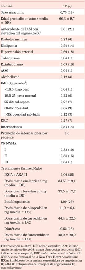 Al momento de iniciar el estudio, un total de 212 pacientes controlados en la UMIC tenían cardiopatía isquémica como etiología definida de su ICFEr; 105 de ellos tenían antecedente de IAM documentado, 40 de los cuales se encontraban en la cohorte activa y cumplían los criterios de inclusión. Siete pacientes presentaron algún criterio de exclusión, cinco pacientes retiraron el consentimiento y dos pacientes se perdieron durante el seguimiento. Esto resultó en la inclusión de 26 pacientes entre abril de 2013 y abril de 2015.