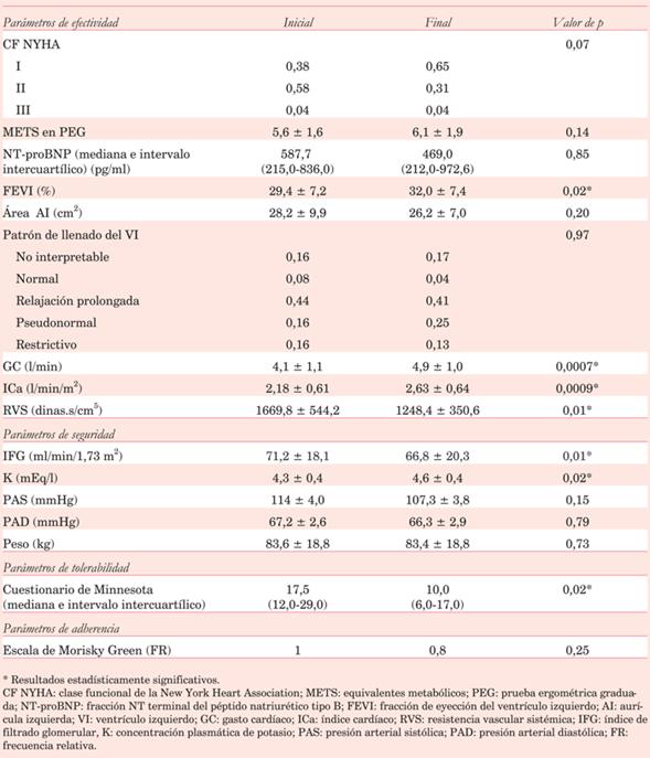 Se midieron variables clínicas de efectividad (clase funcional y capacidad funcional al ejercicio), humorales (NT-ProBNP) y parámetros estructurales y hemodinámicos obtenidos por ecocardiografía Doppler (FEVI, área auricular izquierda, patrón de llenado transmitral, gasto cardíaco [GC], índice cardíaco [ICa] y resistencia vascular sistémica [(RVS]). Además se obtuvieron datos sobre seguridad (eventos adversos graves: necesidad de hospitalización por cualquier causa, muerte), tolerabilidad (percepción en el cuestionario de calidad de vida de Minnesota) y adherencia (escala de Morisky- Green)(11,12).