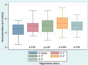K inicial: concentraciones plasmáticas de potasio basales previas al inicio del tratamiento; K 2°: concentraciones plasmáticas de potasio a la semana de iniciar eplerenona; K 3°: concentraciones plasmáticas de potasio al mes; K 4°: concentraciones plasmáticas de potasio a los tres meses; K 5°: concentraciones plasmáticas de potasio a los seis meses.