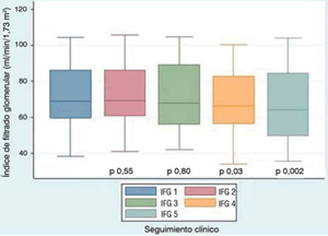 IFG 1: índice de filtrado glomerular previo al inicio de eplerenona; IFG 2: índice de filtrado glomerular a la semana de inicio de eplerenona; IFG 3: índice de filtrado glomerular al mes; IFG 4: índice de filtrado glomerular a los 3 meses; IFG 5: índice de filtrado glomerular a los 6 meses.