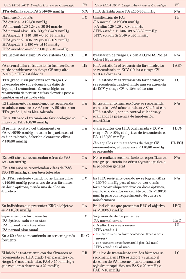 La hipertensión arterial (HTA) es un problema de salud a nivel mundial reconocido desde hace muchos años. Sin embargo, su prevención, diagnóstico y tratamiento siguen siendo subóptimos. Las sociedades internacionales de Cardiología publican de forma periódica guías de práctica clínica con la intención de actualizar el conocimiento y ofrecer herramientas para su adecuado manejo. Recientemente se publicaron las guías del Colegio Americano de Cardiología(1) (ACC por su sigla en inglés) y de la Sociedad Europea de Cardiología(2) (ESC por su sigla en inglés). El descenso de los puntos de corte para considerar HTA propuesto por la guía americana ha generado importante controversia desde su publicación en el año 2017. En 2018 la guía europea mantiene la definición incambiada con respecto a ediciones anteriores.