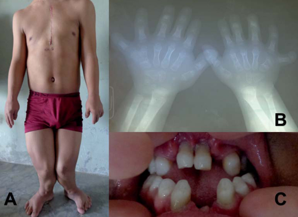 Paciente masculino de 20 años, nacido en la región costa de Ecuador. Padres con cuarto grado de consanguinidad. Antecedentes prenatales: ecografía a las 36 semanas de gestación que reporta dimorfismo corporal. Antecedentes quirúrgicos: resección de un dedo supernumerario postaxial en ambas manos y colocación de material de osteosíntesis en ambas rodillas a los 9 años. Antecedentes familiares: tres primos segundos de lado paterno con discapacidad intelectual y dos primos de lado materno con acondroplasia, quienes fallecieron por causa desconocida.