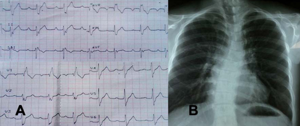A. Electrocardiograma, aVR, aVL y aVF registradas a 1mV/5mm: Ritmo sinusal, 75 lpm, Eje QRS - 90°, intervalo PR de 240 ms, complejo QRS de 120 ms con morfología de bloqueo completo de rama derecha y hemibloqueo anterior izquierdo. B. Radiografía A-P: Situs solitus, índice cardiotorácico de 0,48, cono de arteria pulmonar prominente, aumento de la trama vascular, escoliosis de la columna dorsal.