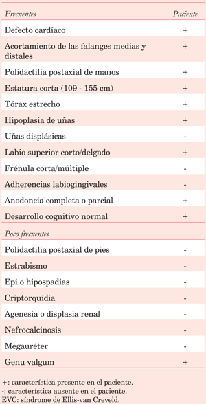 Las características clínicas típicas del síndrome son condrodistrofia, con una talla promedio en el adulto entre 109 y 155 cm; polidactilia, afectando principalmente las manos, comúnmente ambas, y en raras ocasiones los pies; displasia ectodérmica, presentándose como anormalidades en dientes (erupción tardía, anodoncia parcial) y uñas (hipoplásicas, displásicas, friables, ausentes), y anormalidades cardíacas, siendo principalmente afectada la aurícula. El desarrollo cognitivo es normal(5,6,8). En este paciente encontramos la tétrada clásica, por lo que es posible realizar el diagnóstico clínico de EVC (tabla 1).