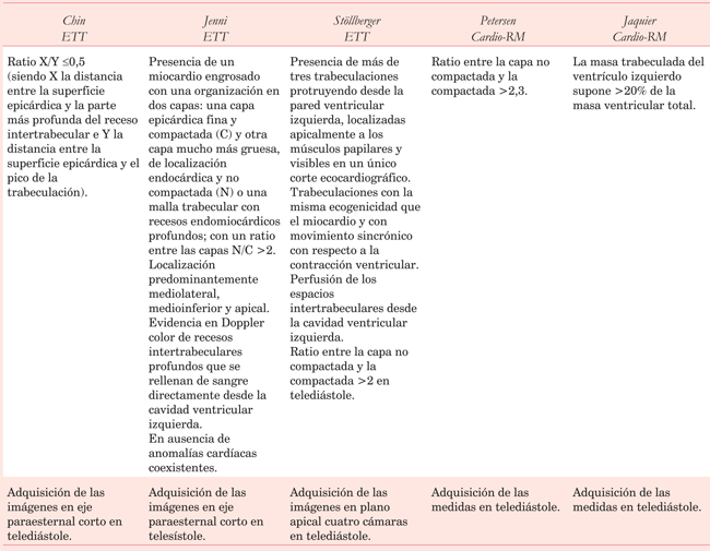 El ecocardiograma transtorácico (ETT) es la técnica diagnóstica de primera elección para la MCNC(2). Se han propuesto fundamentalmente tres criterios diagnósticos diferentes, a pesar de que no hay una definición universalmente aceptada: