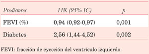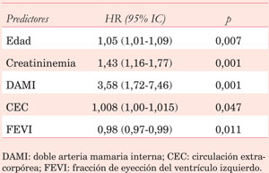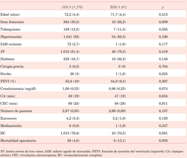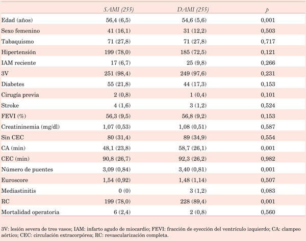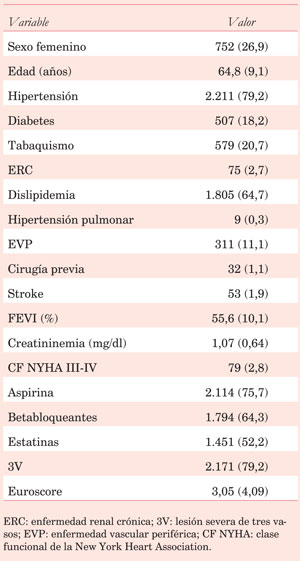 Se extrajeron las siguientes variables demográficas de la población de estudio: sexo, edad, dislipemia, hipertensión, diabetes, tabaquismo, insuficiencia renal, hipertensión pulmonar, enfermedad vascular periférica, cirugía cardíaca previa, fracción de eyección del ventrículo izquierdo (FEVI), creatininemia, clase funcional de la New York Heart Association (NYHA), lesión de tres vasos, Euroscore, y uso de aspirina, estatinas y betabloqueantes.