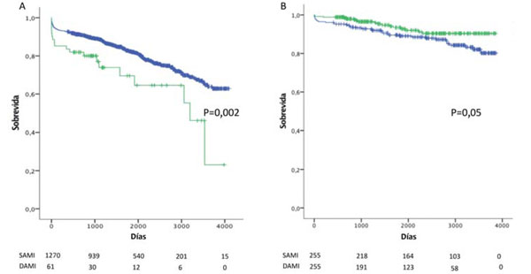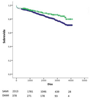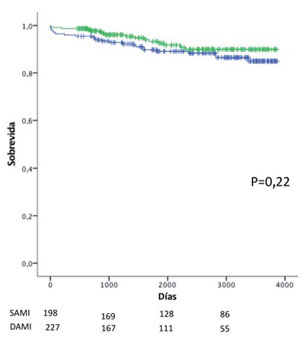 Sobrevida global en pacientes que reciben SAMI (azul) y DAMI (verde) p=0,013.