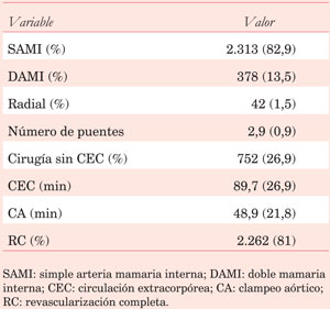 Las variables operatorias recabadas son las siguientes: uso de DAMI, uso de arteria radial, número de puentes, tiempo de clampeo aórtico, tiempo de circulación extracorpórea (CEC), cirugía sin CEC.
