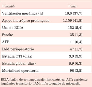 Se define mortalidad operatoria como la muerte hasta los 30 días de la cirugía o durante su internación. Uso prolongado de inotrópicos como el uso mayor a 12 horas. Revascularización completa se definió como la realización de al menos un puente a cada uno de los tres territorios coronarios con lesión mayor a 50%.