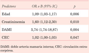 DAMI y arteria radial fueron utilizados en 13,5% y 1,5%, respectivamente. Se realizaron 2,9±0,9 puentes por paciente y en 26,9% de los casos la cirugía fue sin CEC. El tiempo medio de pinzamiento aórtico y CEC fue de 48,9±21,8 min y 89,7±26,9 min (Tabla 2). La mortalidad operatoria fue de 3,5% y la incidencia de complicaciones posoperatorias fue baja (Tabla 3).