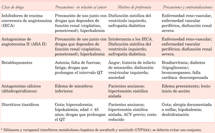 En la tabla 2 se desarrollan los principales aspectos a considerar cuando se elige un agente antihipertensivo, tomando en cuenta precauciones o contraindicaciones relativas al cáncer o su tratamiento, junto con indicaciones obligatorias o precauciones que surgen del contexto médico general de cada paciente.