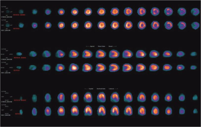 Se realizó tratamiento con betabloqueantes y control de factores de riesgo cardiovascular. Asintomática en la evolución; 99mTc-MIBI de control al mes, basal y en esfuerzo: sin alteraciones de la perfusión miocárdica (figura 2).