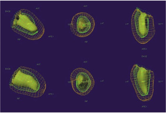 Imágenes correspondientes a función ventricular durante el período agudo. En las imágenes superiores, correspondientes a fin de sístole ventricular, se observa disquinesia del segmento anteroapical, coincidente con los hallazgos ecocardiográficos. Dichas alteraciones desaparecen en el estudio basal al mes del evento agudo.