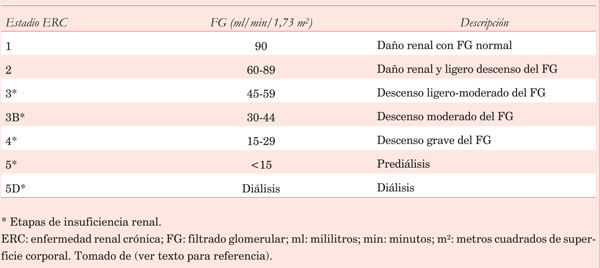 El concepto de insuficiencia renal crónica (IRC), que es diferente al de ERC, implica un deterioro progresivo e irreversible (durante más de tres meses) de la función renal determinada por el filtrado glomerular (FG) <60 ml/min/1,73 m2. Según esta evolución se establecen distintos estadios (tabla 3)(46).