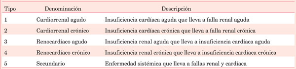 La relación estrechísima entre la función renal y la cardíaca ha sido reconocida desde hace muchos años(1,2). Y que la disfunción de cada uno de estos órganos repercute sobre el normal funcionamiento del otro es también un dato tomado en cuenta cotidianamente en la evaluación de pacientes con afectación de uno u otro(3,4). En la última década, a partir de publicaciones de Ronco y colaboradores, se popularizó el concepto de síndrome cardiorrenal (SCR)(5-7). Esta definición engloba un amplio espectro de condiciones y enfermedades en las que la disfunción renal y cardíaca coexisten y se solapan. Cinco tipos de SCR han sido descritos (tabla 1) de acuerdo al compromiso inicial del corazón (SCR 1 y 2), del riñón (SCR 3 y 4), o de ambos simultáneamente a partir de un factor patógeno común (SCR 5). En esta revisión nos centraremos en los SCR tipo 1 y 2, aquellos que se inician a partir de la afectación cardíaca y en los que la disfunción renal aparece como consecuencia de la misma.