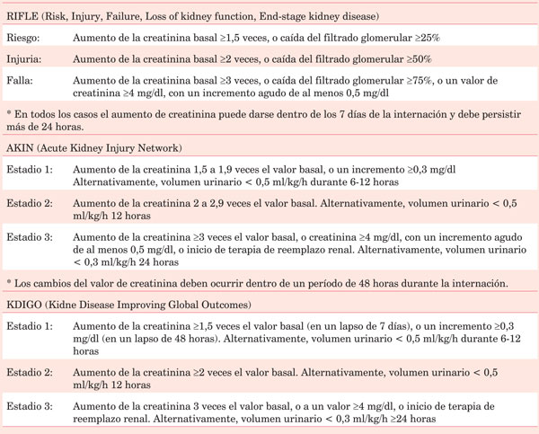 Como se verá más adelante, el empeoramiento de la función renal puede ser en realidad un pseudoempeoramiento; por otra parte, la elevación de la creatinina por sí sola carece de suficiente sensibilidad (se da en forma tardía) y especificidad (puede simplemente reflejar hemoconcentración) para reflejar un verdadero daño renal. En los últimos años aparecieron nuevas escalas para definir la presencia de injuria renal aguda, que tratan de ser más certeras a la hora de señalar daño y mejorar la capacidad pronóstica de eventos: RIFLE (Risk, Injury, Failure, Loss of kidney function, End-stage kidney disease)(9), AKIN (Acute Kidney Injury Network)(10) y KDIGO (Kidney Disease: Improving Global Outcomes)(11). La tabla 2 presenta los criterios de cada una de ellas. Como se puede observar, diferencian categorías de aumento de la creatinina y plantean también diferentes períodos de tiempo en que dicho aumento debe presentarse y mantenerse, a diferencia del criterio básico de empeoramiento de la función renal, en que el aumento de 0,3 mg/dl respecto del basal puede presentarse en cualquier momento y no se requiere que persista.