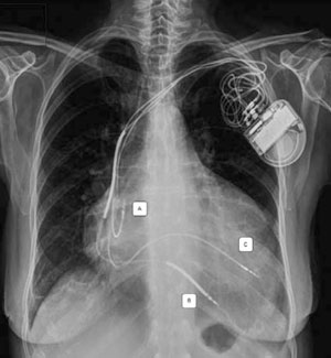 Radiografía de tórax de un paciente a quien se le implantó un TRC-D por vía endocárdica transeptal usando la técnica Jurdham. A. Electrodo auricular. B. Electrodo ventricular con doble bobina de desfibrilación. C. Electrodo endocárdico en pared lateral del VI a través de septum interauricular. Gentileza del Dr. Benjamin Elencwajg.