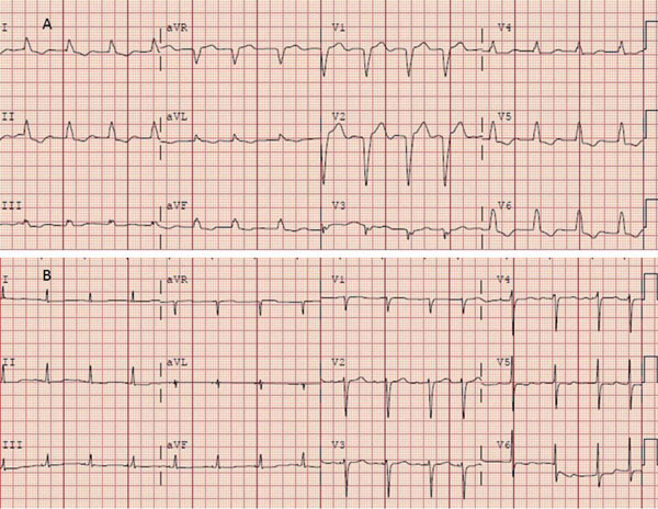 ECG previo (A) a la estimulación hisiana (BCRI) y posterior (B) (QRS fino). Gentileza del Dr. John Mandrola.