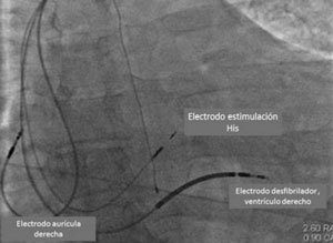 Imagen radioscópica de un paciente en el que se realizó implante de CDI bicameral con marcapaseo de His. Modificado de referencia 43.