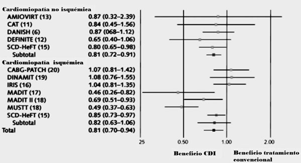 En contraste con la extensa evidencia que se ha presentado para la CMI, la evidencia para la CMNI es menos robusta. Las guías actuales (tabla 1) recomiendan el implante de CDI en cierto grupo de pacientes con CMNI, basadas en un metaanálisis publicado en 2004 que reúne los resultados positivos derivados de los estudios SCD-HeFTl (cuyos datos fueron presentados en sesión científica de marzo de 2004, previo a su publicación)(10) y del COMPANION(14), y los negativos derivados de los estudios CAT(15), AMIOVIRIT(16) y DEFINITE(17). El metaanálisis muestra una reducción de 31% de la mortalidad con CDI vesus tratamiento convencional(18).
