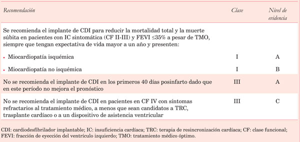Si bien hoy día el implante de CDI en prevención primaria continúa siendo una indicación clase I en las guías para pacientes con CMNI, FEVI <35% y CF II-III (tabla 1), es probable que a la luz de los últimos estudios analizados se reduzca la indicación en esta subpoblación.