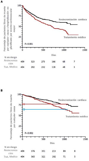 Curvas de Kaplan-Meier del estudio CARE-HF para tiempo al end point primario (A) y secundario (B). Modificado de referencia 24.