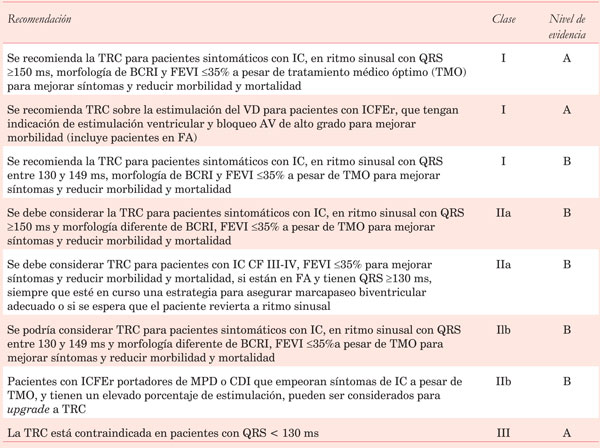 Tanto las guías europeas de ESC/EHRA(13) como las estadounidenses de ACC/AHA/HRS(29) tienen como indicación clase I la TRC-D en pacientes con IC CF II-III y IV ambulatoria, FEVI <35%, ritmo sinusal y BCRI con duración del QRS >130 ms. Esta y otras recomendaciones de TRC se detallan en la tabla 3.