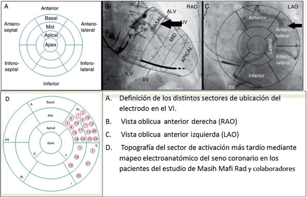 Definición de los distintos sectores de ubicación del electrodo en el VI y su visualización según los enfoques (A, B, C) y resultados del mapeo en pacientes del estudio de Masih Mafi Rad (D). Modificado de referencia 39.