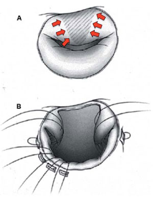 Se escinde solamente un pequeño triángulo de la valva anterior (flechas rojas en A). El remanente tisular se fija lateralmente usando suturas protésicas, como se ilustra en B). Modificado de referencia 68.