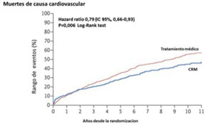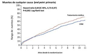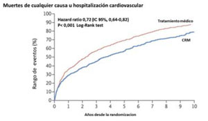 En el análisis estadístico de los resultados a cinco años no hubo diferencias en el endpoint primario de muertes por cualquier causa entre el grupo del tratamiento médico aislado y el sometido a tratamiento médico más CRM. Se vio menor incidencia de los endpoints secundarios de muerte cardiovascular y muerte cardiovascular más hospitalización por causas cardíacas en el grupo de CRM.